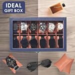 Presents Luxury 12 Slot Watch Box for Men & Women Lockable Leather Watch Organizer with Glass Lid, Soft Velvet Cushions, Premium Display & Storage Case for Watches (Blue)